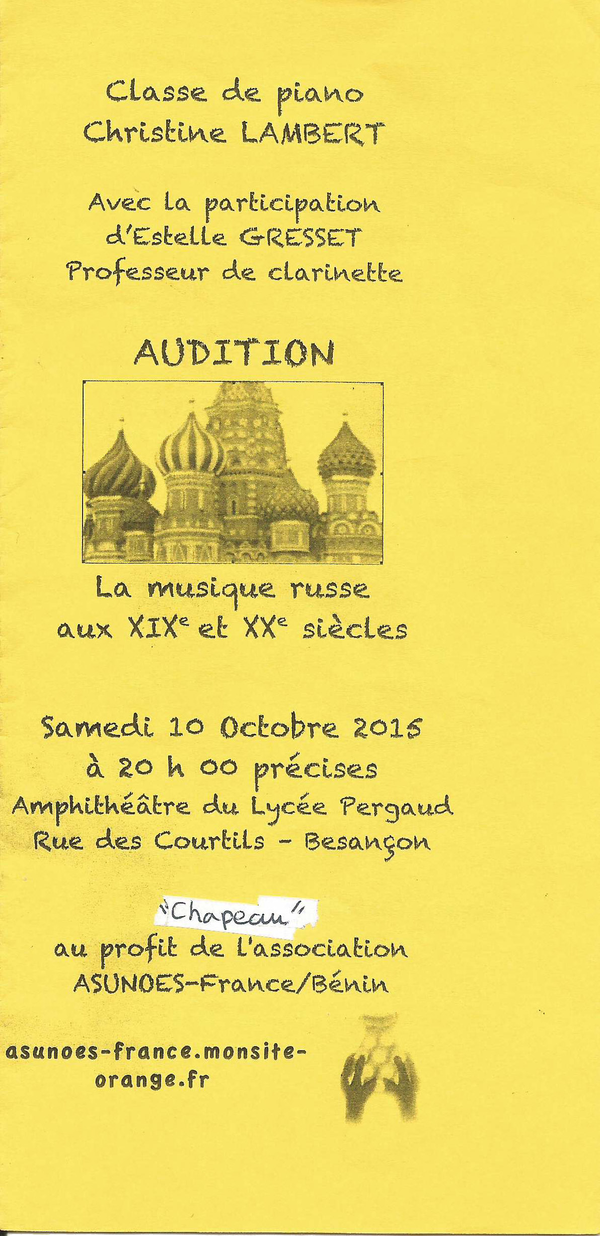 Christine a immédiatement accepté ainsi que tous ses élèves qui vont nous interpréter ce soir en solo ou en duo avec d'autres instruments des œuvres tirées du répertoire russe aux XIXème et XXème siècle. Je les remercie d'avance pour leur prestation.