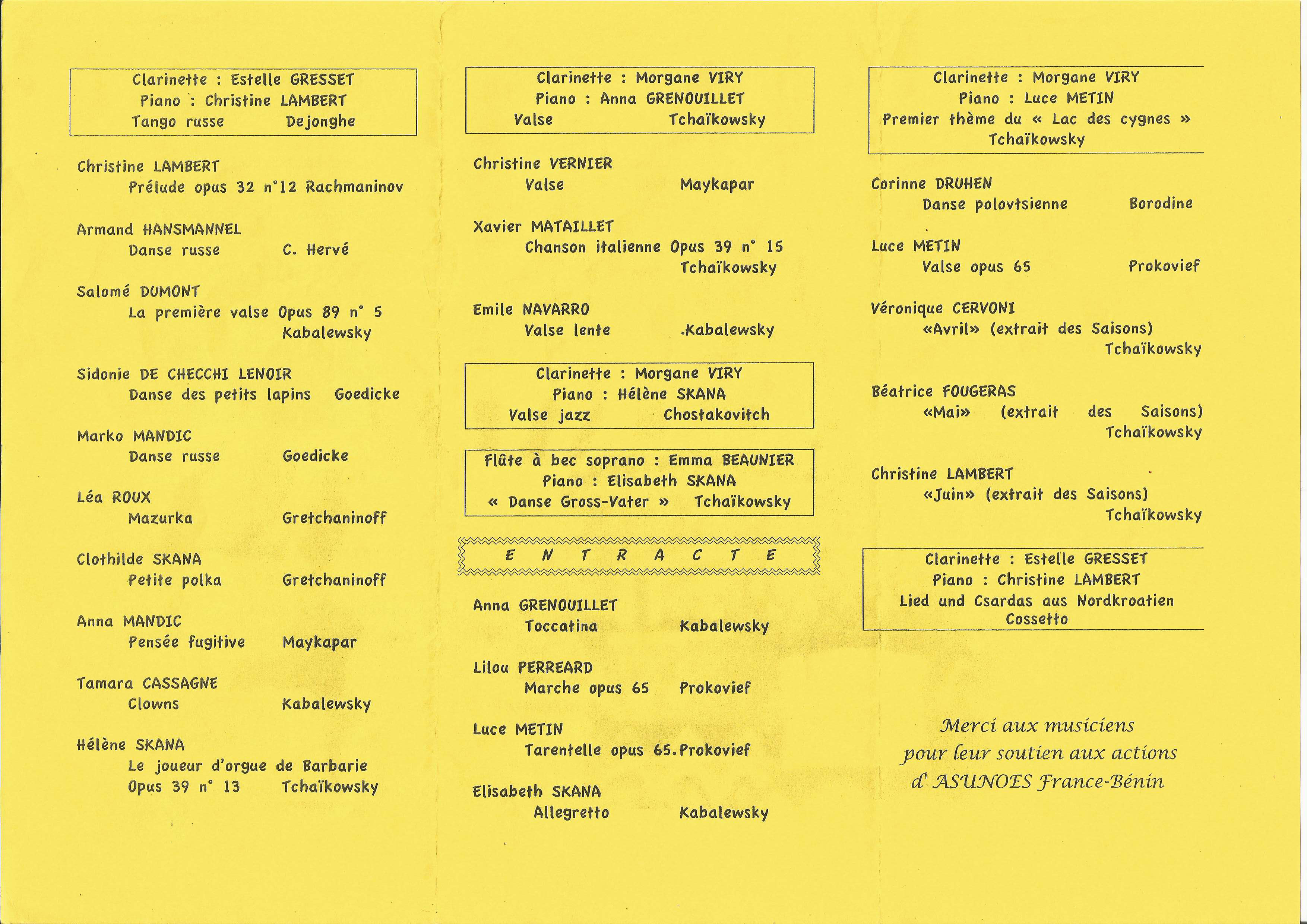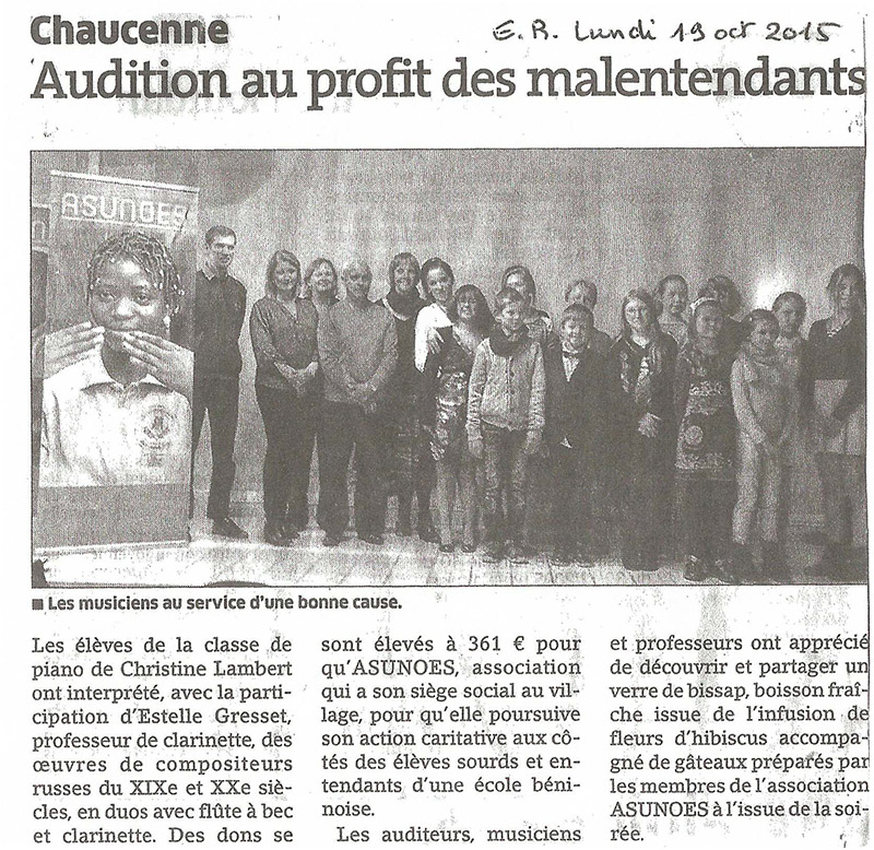 C'est avec grand plaisir que nous vous accueillons ce soir, Pascale Dard présidente de l'association ASUNOES-France/Bénin, Christine Lambert, professeur de piano et moi-même, membre de l'Association, pour une audition un peu particulière.