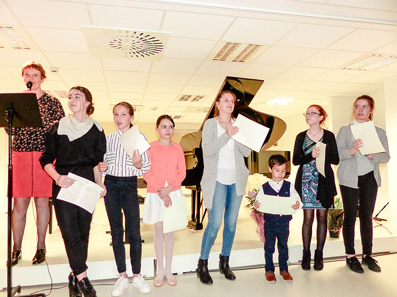 Remise des diplômes du concours d'Épinal 2017 : Chloé, Chlotilde, Sidonie, Hélène, Tüng-Lâm, Tamara et Lilou.